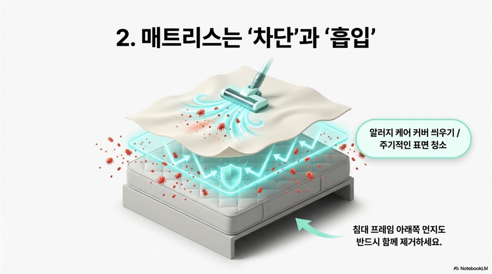 매트리스는 절대 방치하면 안 되는 핵심 구역입니다. 침실 알레르기 증상이 심하다면 가장 먼저 점검해야 할 곳이 바로 매트리스와 베개입니다.