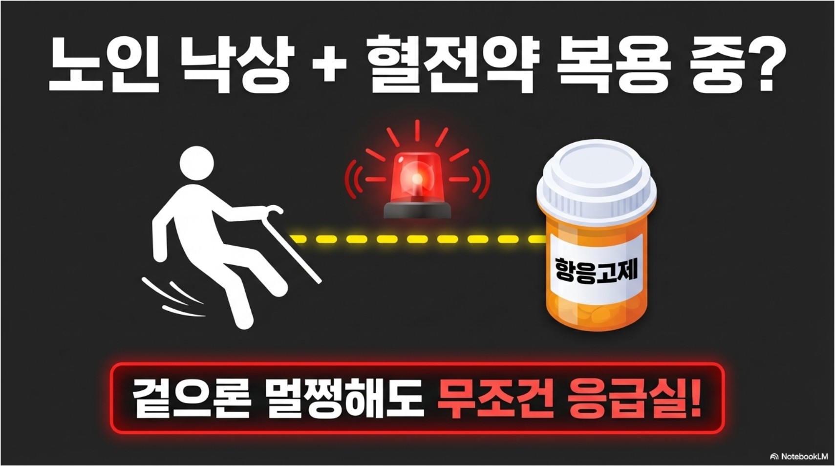 그래서 노인이 넘어진 뒤 “괜찮다”라고 말하더라도, 머리 충격이 있었는지, 허리나 고관절 통증이 있는지, 바로 걸을 수 있는지, 이후 구토나 어지럼증이 생기는지를 꼭 살펴야 합니다. 특히 항응고제나 항혈소판제를 복용 중인 노인은 겉으로 멀쩡해 보여도 두부 외상 평가가 더 중요합니다.