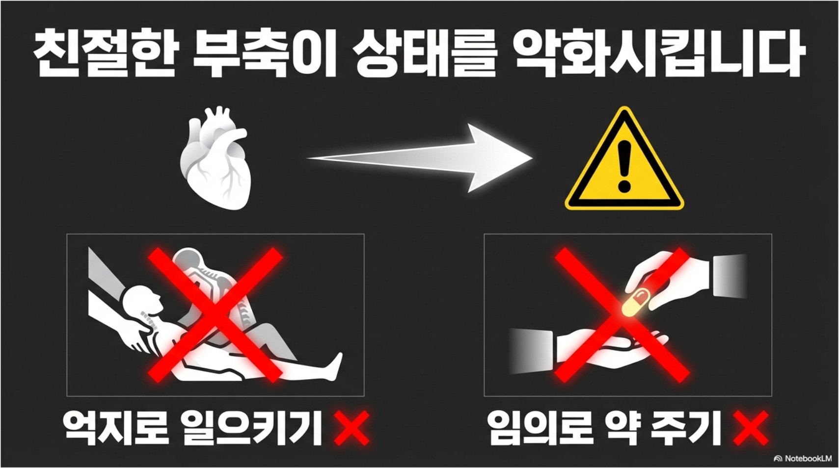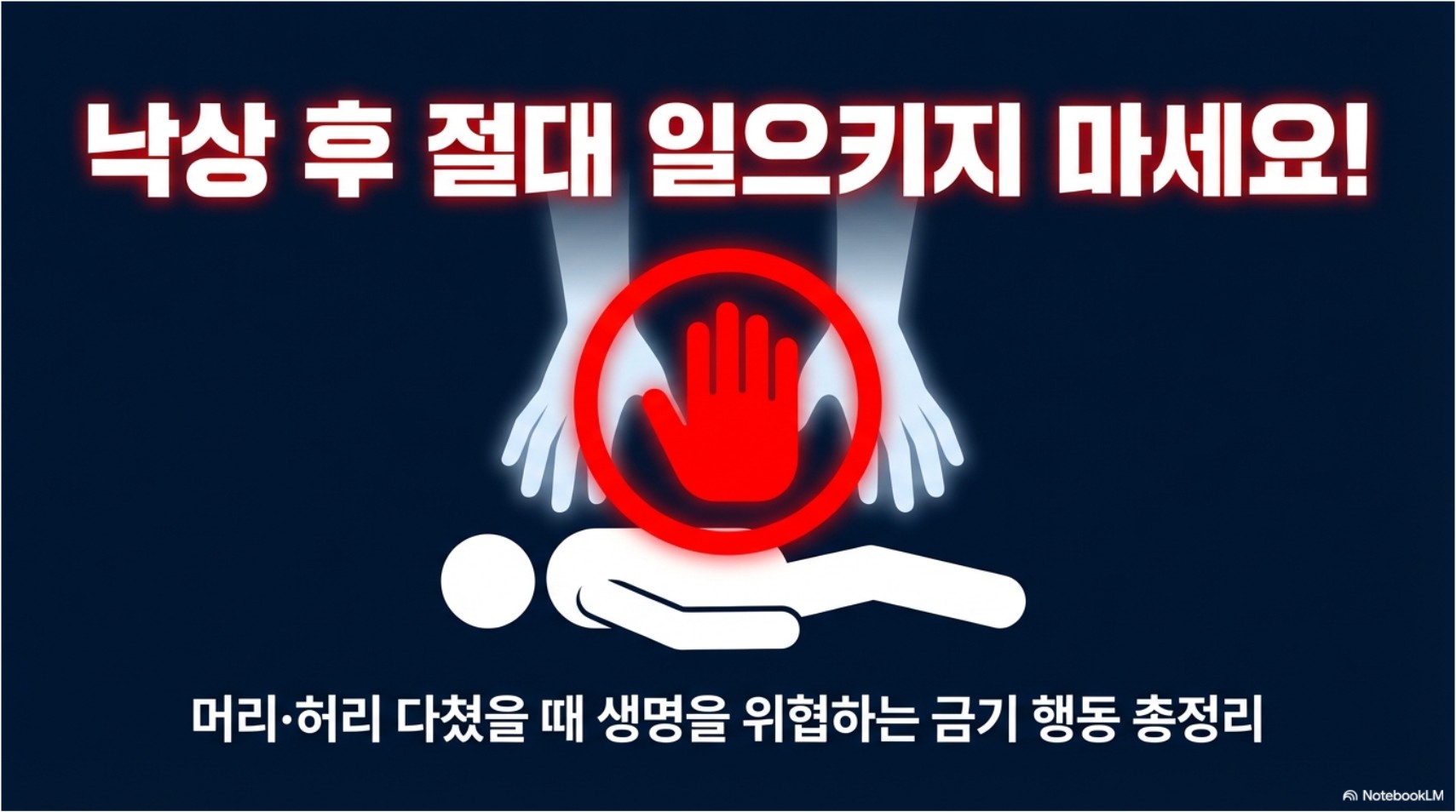 핵심 기억: 낙상 직후의 친절한 부축, 임의의 약 복용 권유, 억지로 걷게 하기, 코나 귀에서 나오는 액체를 막기 같은 행동은 모두 상태를 악화시킬 수 있습니다.