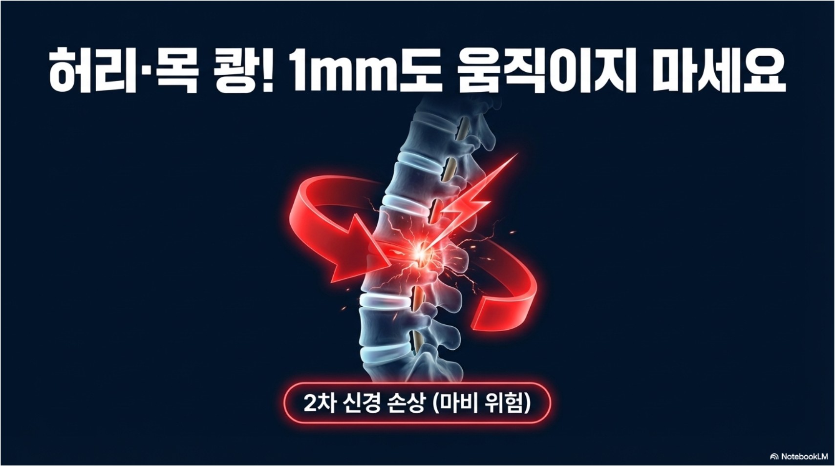 척추 손상은 처음 충격 자체도 문제지만, 그 후 불안정한 척추가 다시 움직이면서 신경을 건드리는 순간 상태가 훨씬 나빠질 수 있습니다. 처음에는 허리 통증만 있던 사람이 이후 다리 저림, 감각 이상, 힘 빠짐, 배뇨 곤란 등으로 이어질 수도 있습니다. 그래서 목이나 허리 손상이 의심될 때는 가능한 한 현재 자세를 유지한 채 움직임을 최소화해야 합니다.