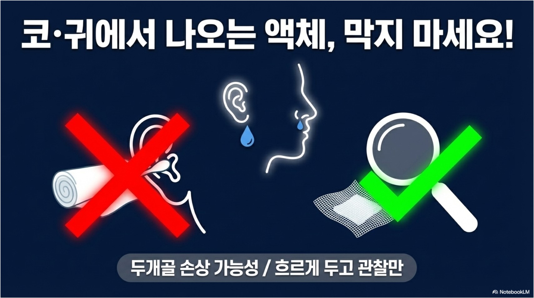 머리를 크게 다친 뒤 귀나 코에서 피나 맑은 액체가 흘러나오면 당황해서 휴지나 솜으로 꽉 막고 싶어 집니다. 그러나 두개골 바닥 손상이 의심되는 상황에서는 귀나 코에서 흐르는 액체를 강하게 막지 않는 것이 중요합니다. 억지로 막는 과정에서 오염 위험이 커지고, 상태 평가에 방해가 될 수 있기 때문입니다.
