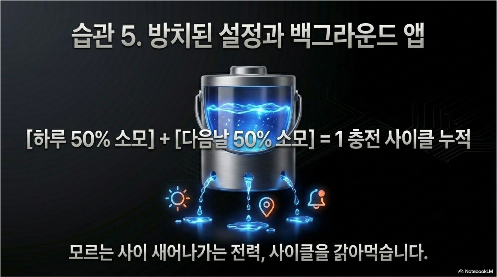 배터리 수명은 충전 습관뿐 아니라 평소 전력 사용량과도 관련이 있습니다. 화면 밝기를 항상 최대로 두거나, 사용하지 않는 앱이 백그라운드에서 계속 실행되면 충전 사이클이 빠르게 누적됩니다.