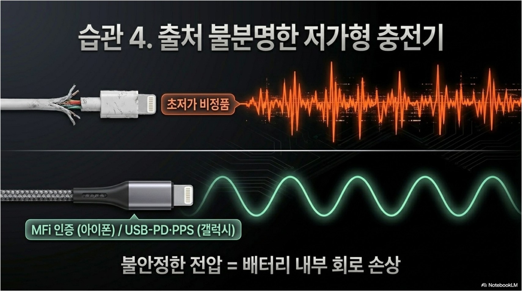 정품 또는 인증 충전기는 과전압, 과전류, 과열을 막기 위한 보호 회로를 갖춘 경우가 많습니다. 반면 품질이 낮은 저가형 충전기나 케이블은 전압이 불안정하거나 충전 중 발열이 심할 수 있습니다.