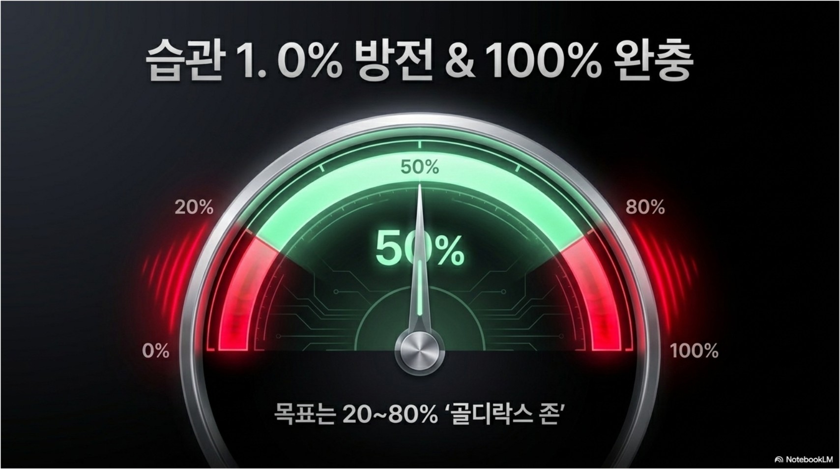 일상에서는 배터리를 20~80% 사이에서 사용하는 것이 가장 현실적인 관리법입니다. 이를 흔히 ‘골디락스 존’이라고 부르기도 합니다. 너무 낮지도, 너무 높지도 않은 구간에서 배터리 부담이 줄어듭니다.