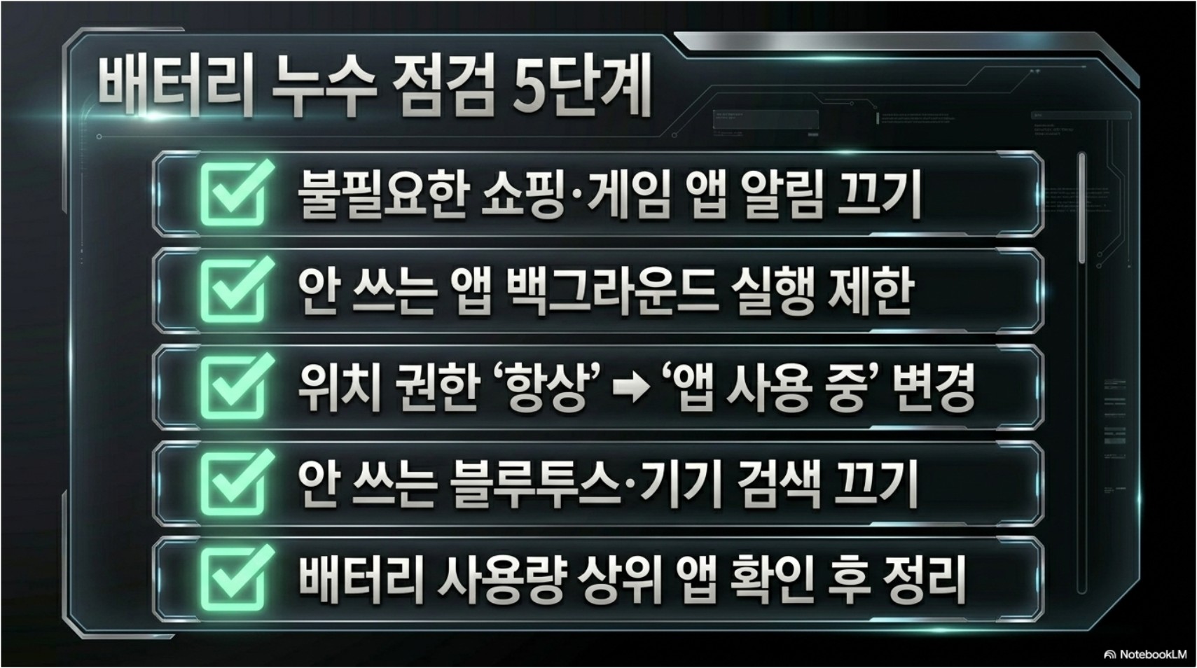 스마트폰 배터리가 유난히 빨리 닳는다면 배터리 자체가 아니라 설정 문제일 수 있습니다. 아래 항목을 순서대로 점검해 보세요.
