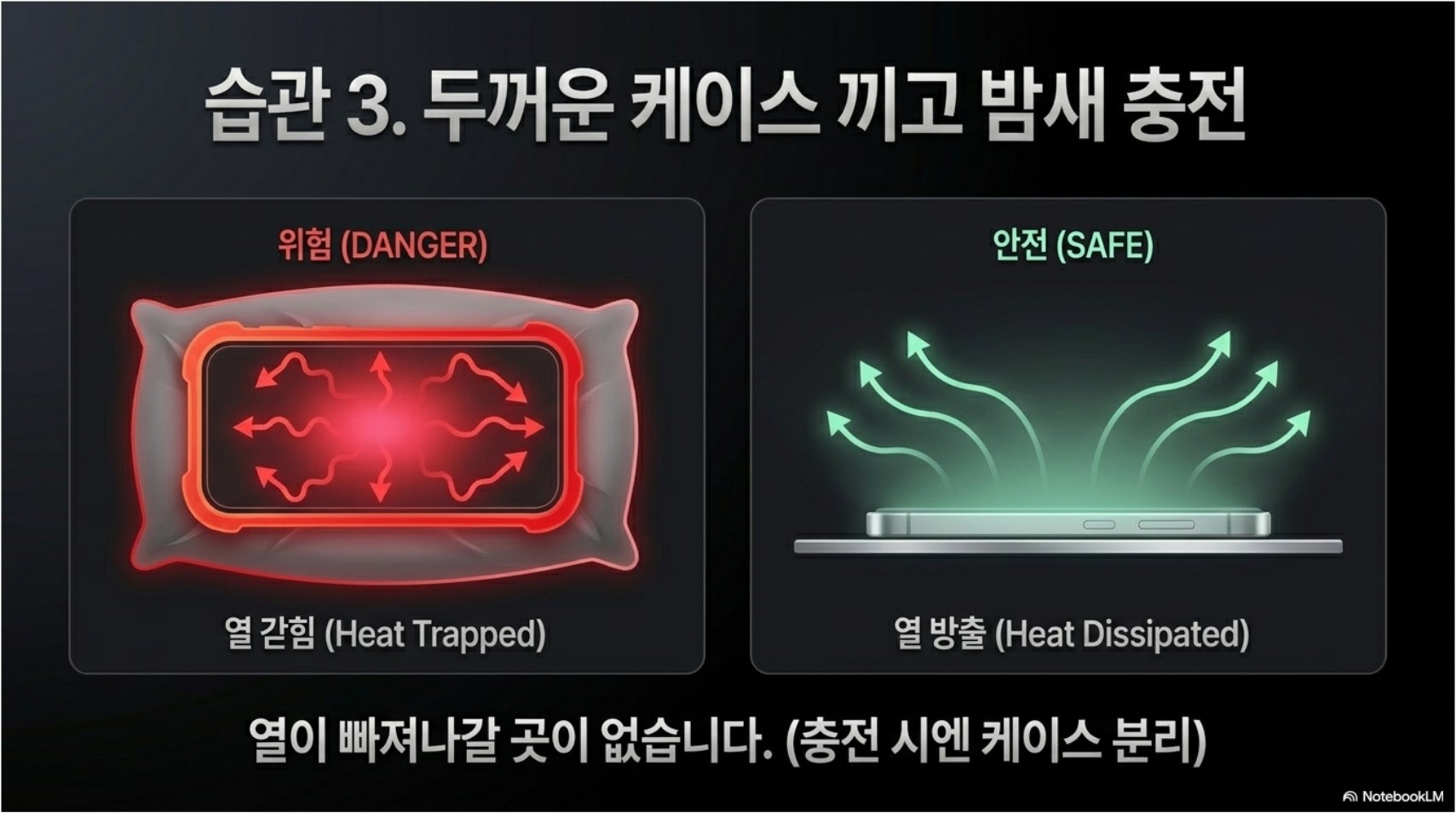 배터리 수명을 줄이는 습관 3: 두꺼운 케이스를 낀 채 밤새 충전하기