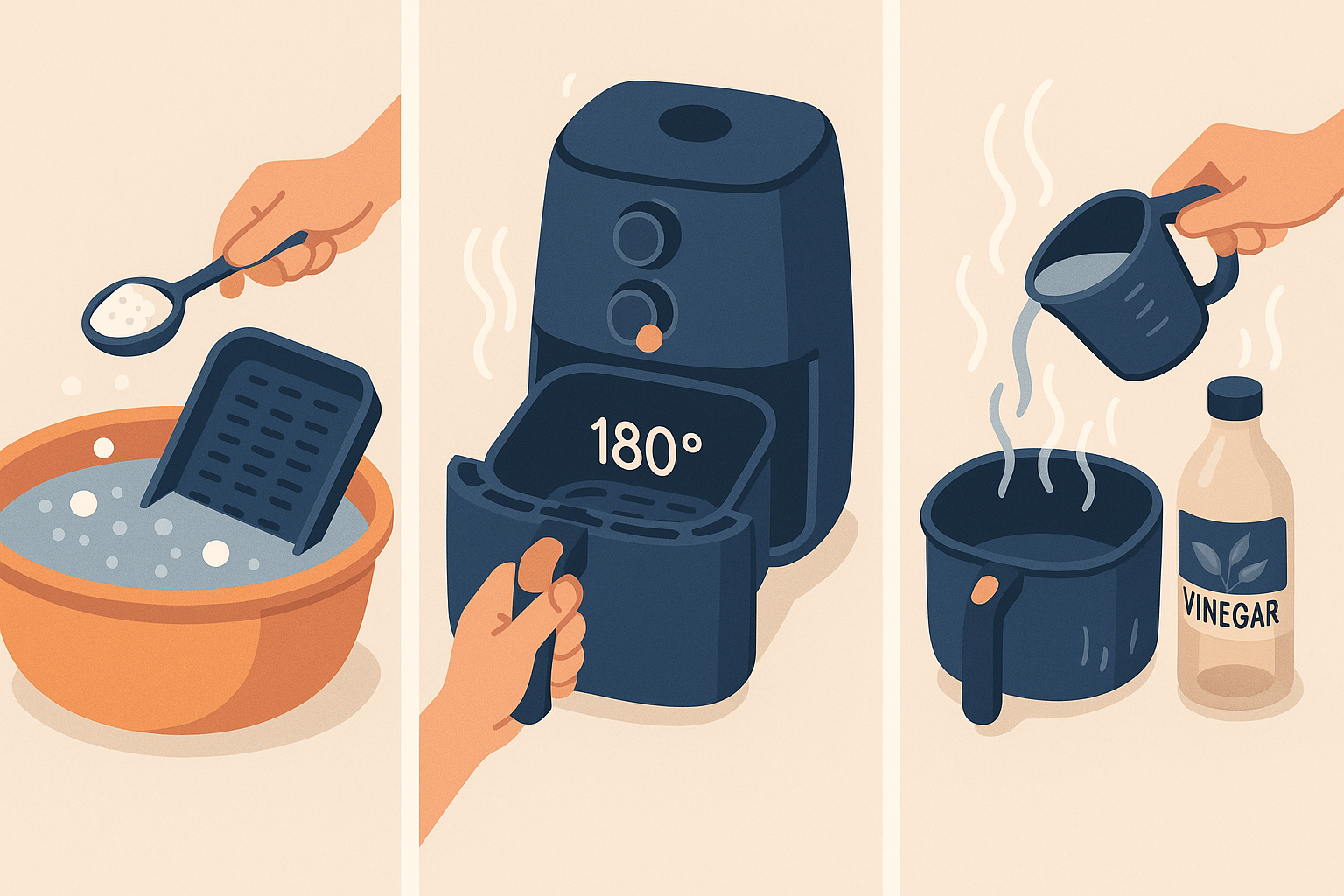🔹 뜨거운 물+베이킹소다 담금세척: 팬과 바스켓을 20분간 담가두세요.
