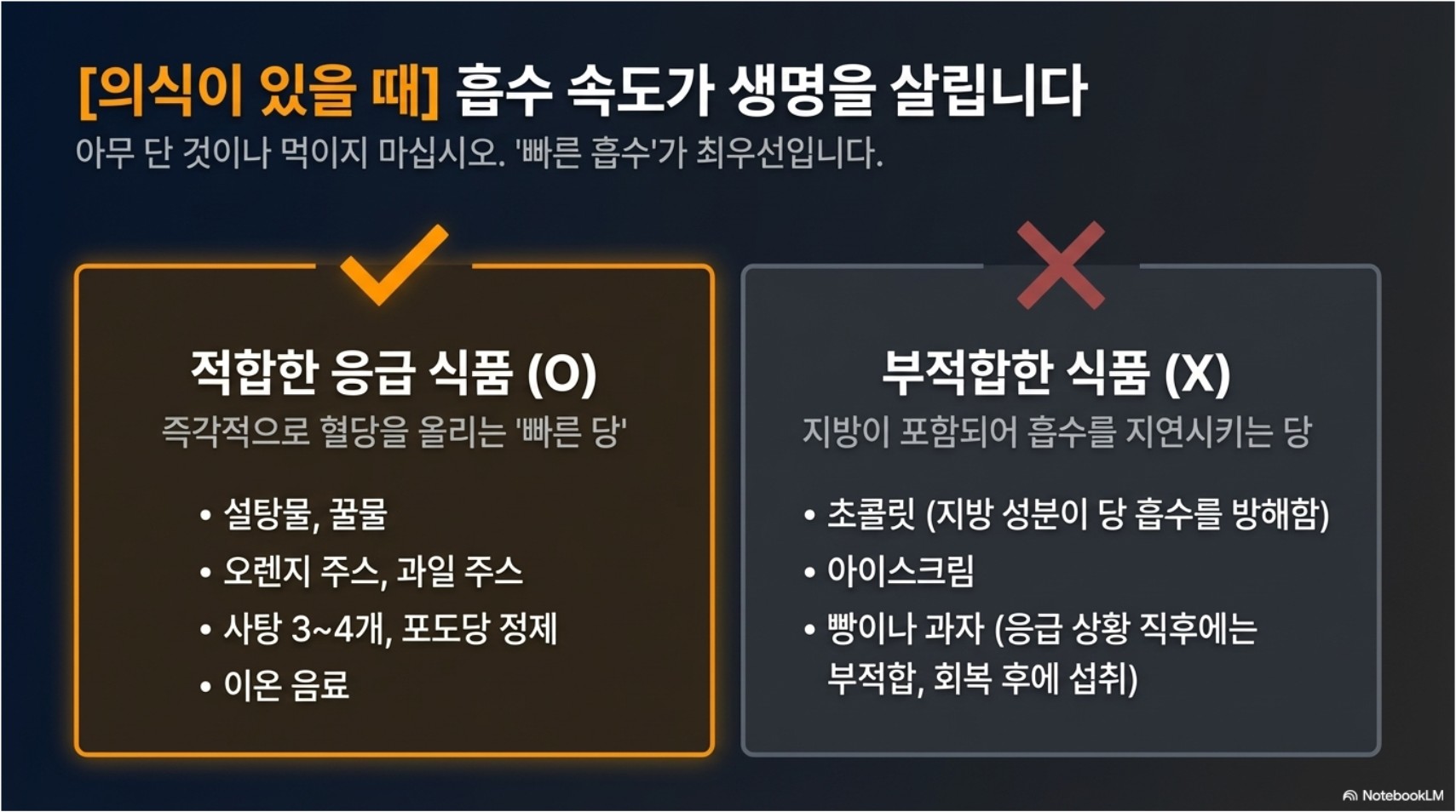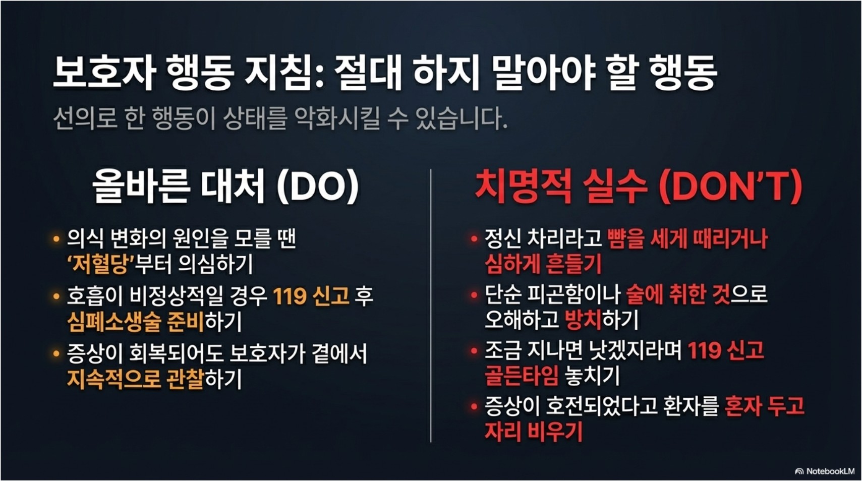 실제 현장에서는 당황하지 않고 순서대로 대응하는 것이 중요합니다. 저혈당 쇼크는 빠르게 진행할 수 있지만, 동시에 올바르게 대응하면 회복 가능성이 높습니다.