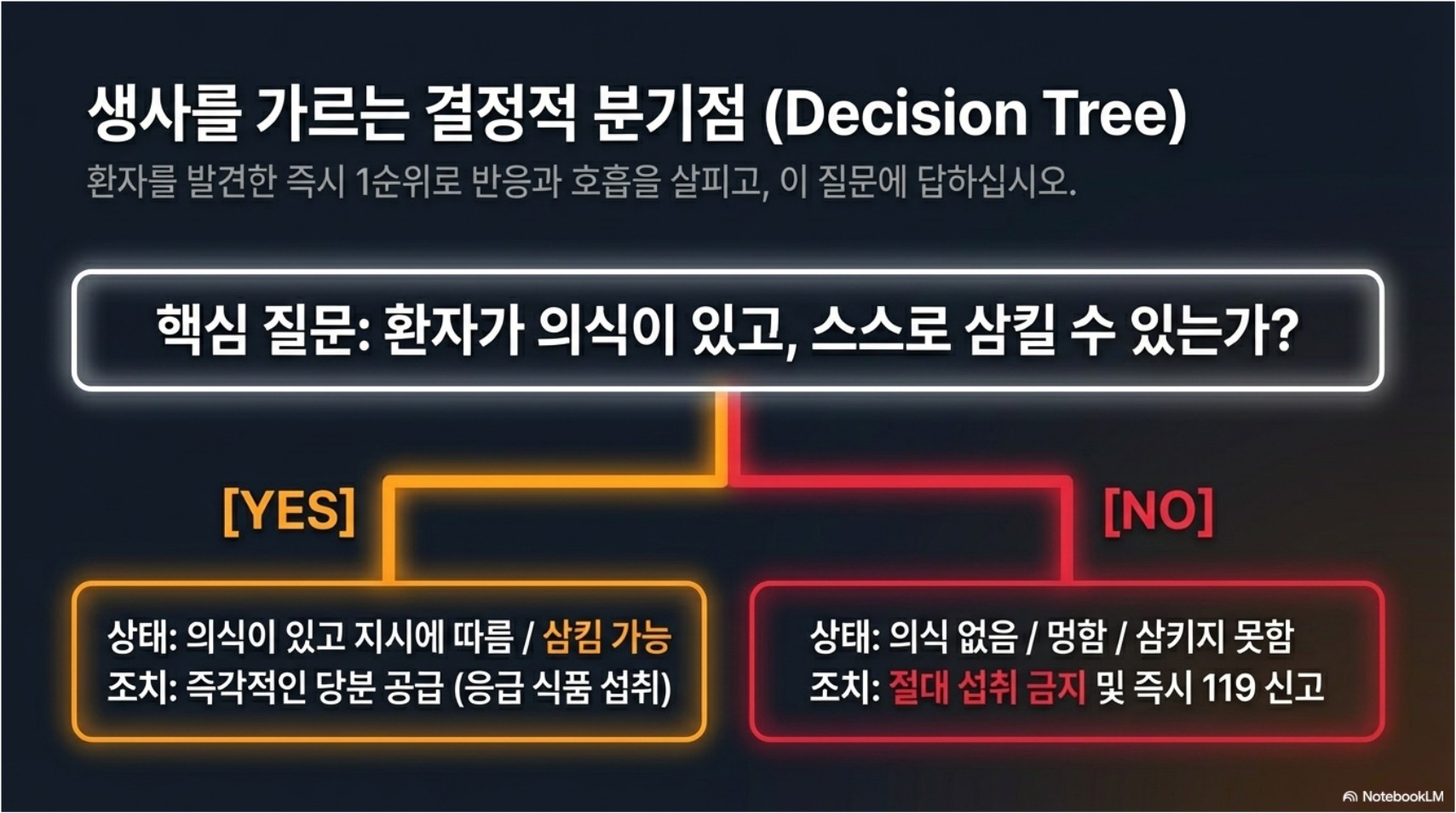 이 단계가 매우 중요합니다. 환자가 의식이 없거나, 반쯤 의식이 있어도 제대로 삼키지 못하는 상태라면 음식, 물, 주스, 사탕, 약을 억지로 먹이면 안 됩니다. 기도로 넘어가 질식할 수 있기 때문입니다.