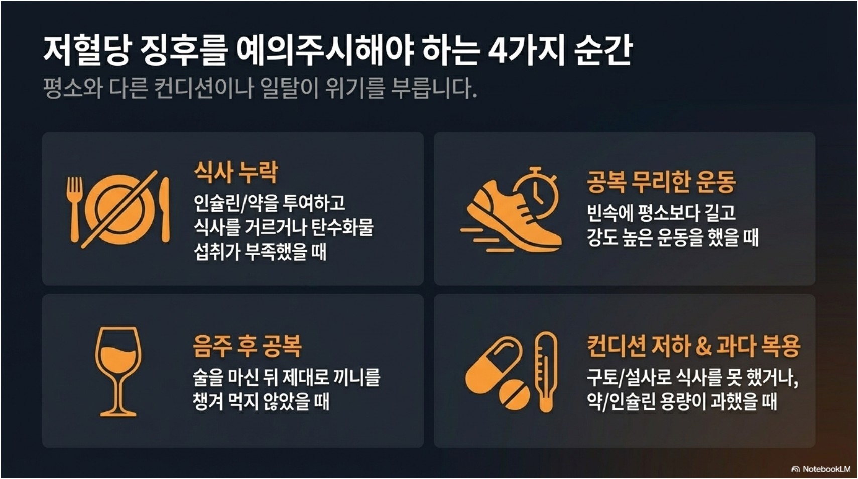 당뇨 환자가 “오늘은 입맛이 없어서 거의 못 먹었다”, “운동을 평소보다 많이 했다”, “술을 마셨다”라고 말한 날에는 저혈당 위험을 특히 더 주의해야 합니다.