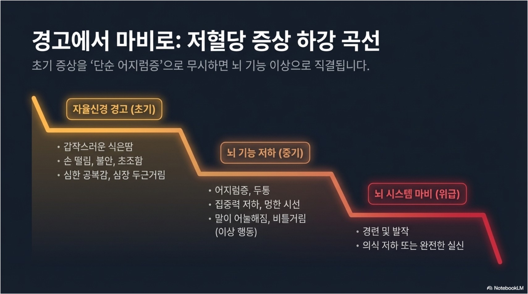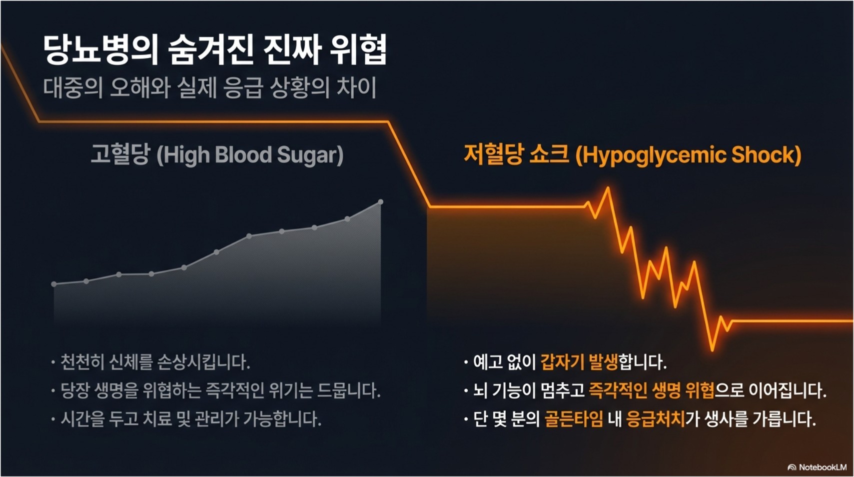 저혈당 쇼크는 단순히 당이 떨어진 정도가 아닙니다. 뇌로 가는 에너지원이 부족해지는 상태이기 때문에 빠른 판단과 즉각적인 응급처치가 지연되면 의식 소실, 사고, 외상, 심한 경우 생명 위협으로 이어질 수 있습니다.