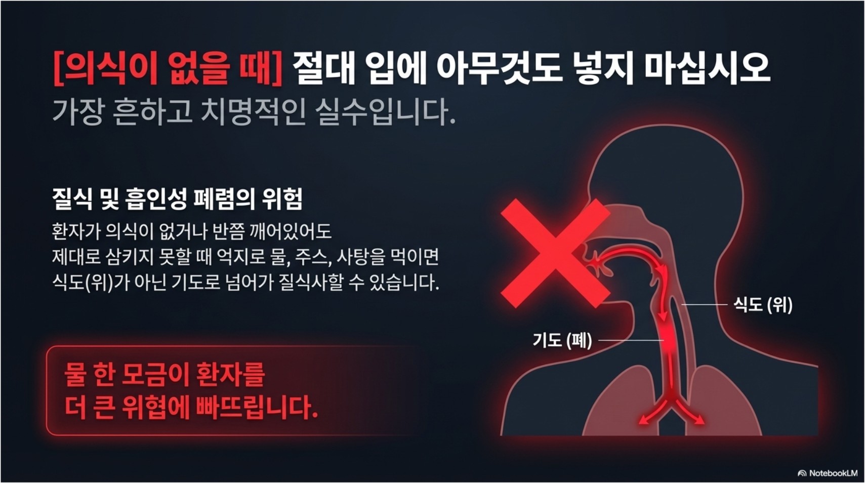 의식이 없는 환자에게 물이나 주스를 먹이는 행동은 매우 위험합니다. 기도 폐쇄와 흡인으로 더 큰 응급상황을 만들 수 있습니다.