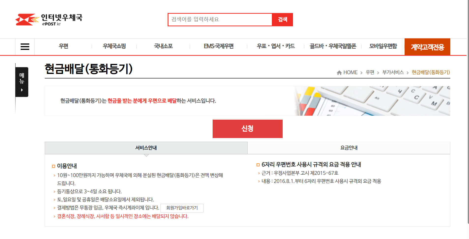2. '현금배달(통화등기)' 메뉴 선택 or 검색 후 신청 클릭