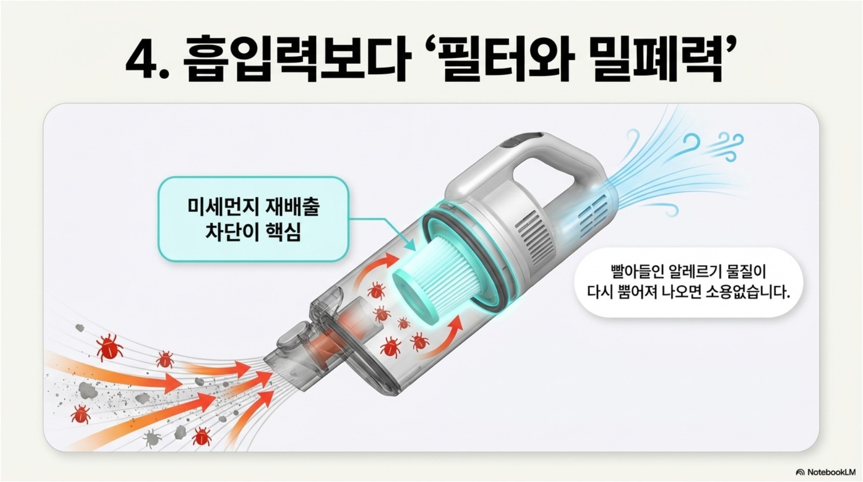 많은 사람들이 흡입력이 강한 청소기만 있으면 집 먼지 진드기 문제를 해결할 수 있다고 생각합니다. 하지만 집 먼지 진드기 제거 방법에서는 단순 흡입력보다도 미세 입자를 다시 밖으로 내뿜지 않는 여과 시스템이 훨씬 중요합니다.