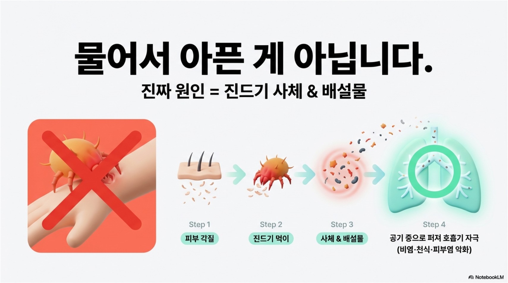 많은 분들이 진드기가 사람을 물거나 피부를 직접 공격한다고 오해하지만, 실제로 문제를 일으키는 것은 진드기 자체보다 배설물과 사체에서 나오는 알레르기 유발 물질입니다. 이 물질은 공기 중에 떠다니며 코, 기관지, 눈, 피부를 자극할 수 있습니다. 그래서 아침에 일어났을 때 특히 증상이 심해지거나, 침구를 털고 난 뒤 재채기가 심해지는 경우가 많습니다.